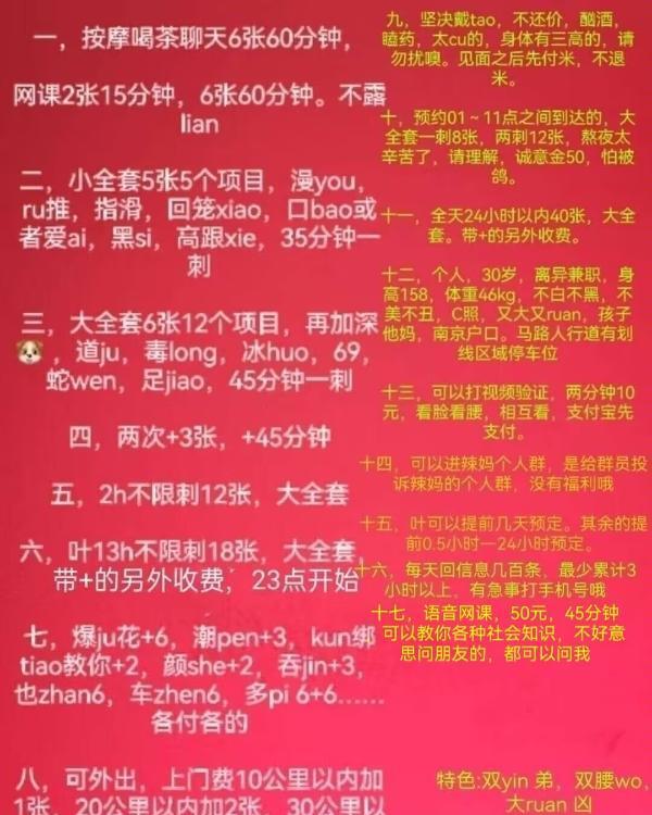 服务项目:深猴,爆菊,朝喷,调教,颜色,吞金,也站,多p,道具,蛇纹,69,冰火,爱爱,无套吹等等