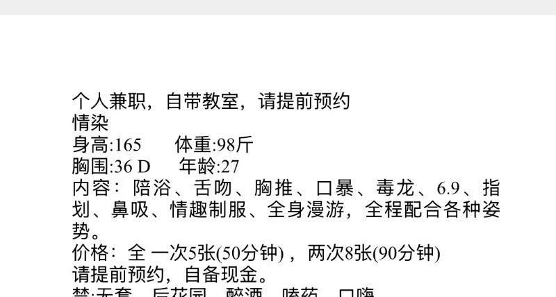 凡是有要求路费/定金/保证金/照片验证/视频验证等任何提前付费的行为,千万不要上当。同时也请注意仙人跳,在寻欢前不要露富和带过于贵重随身物品。本站为分享信息并不对寻欢经历负责,碰到有问题的信息,请及时举报给我们删除信息。