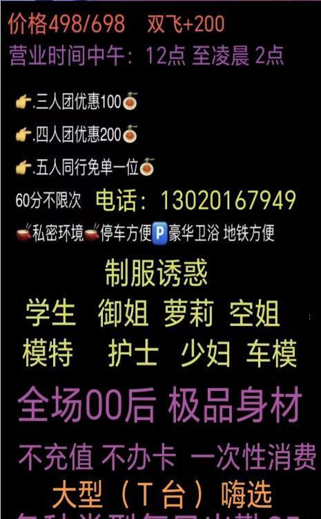 凡是有要求路费/定金/保证金/照片验证/视频验证等任何提前付费的行为,千万不要上当。同时也请注意仙人跳,在寻欢前不要露富和带过于贵重随身物品。本站为分享信息并不对寻欢经历负责,碰到有问题的信息,请及时举报给我们删除信息。